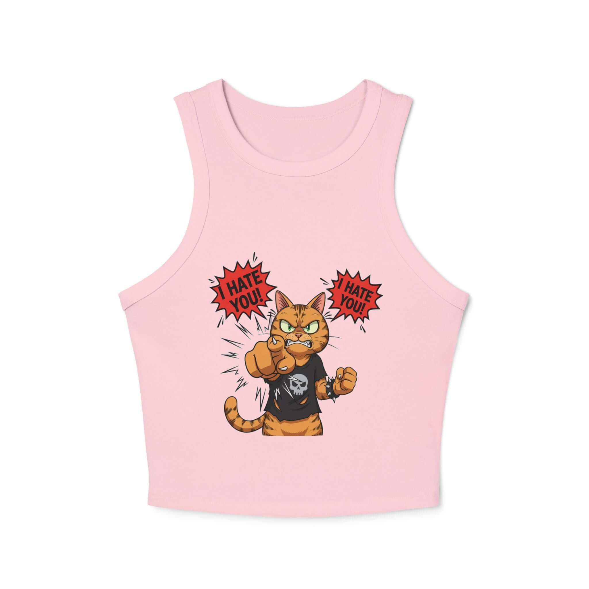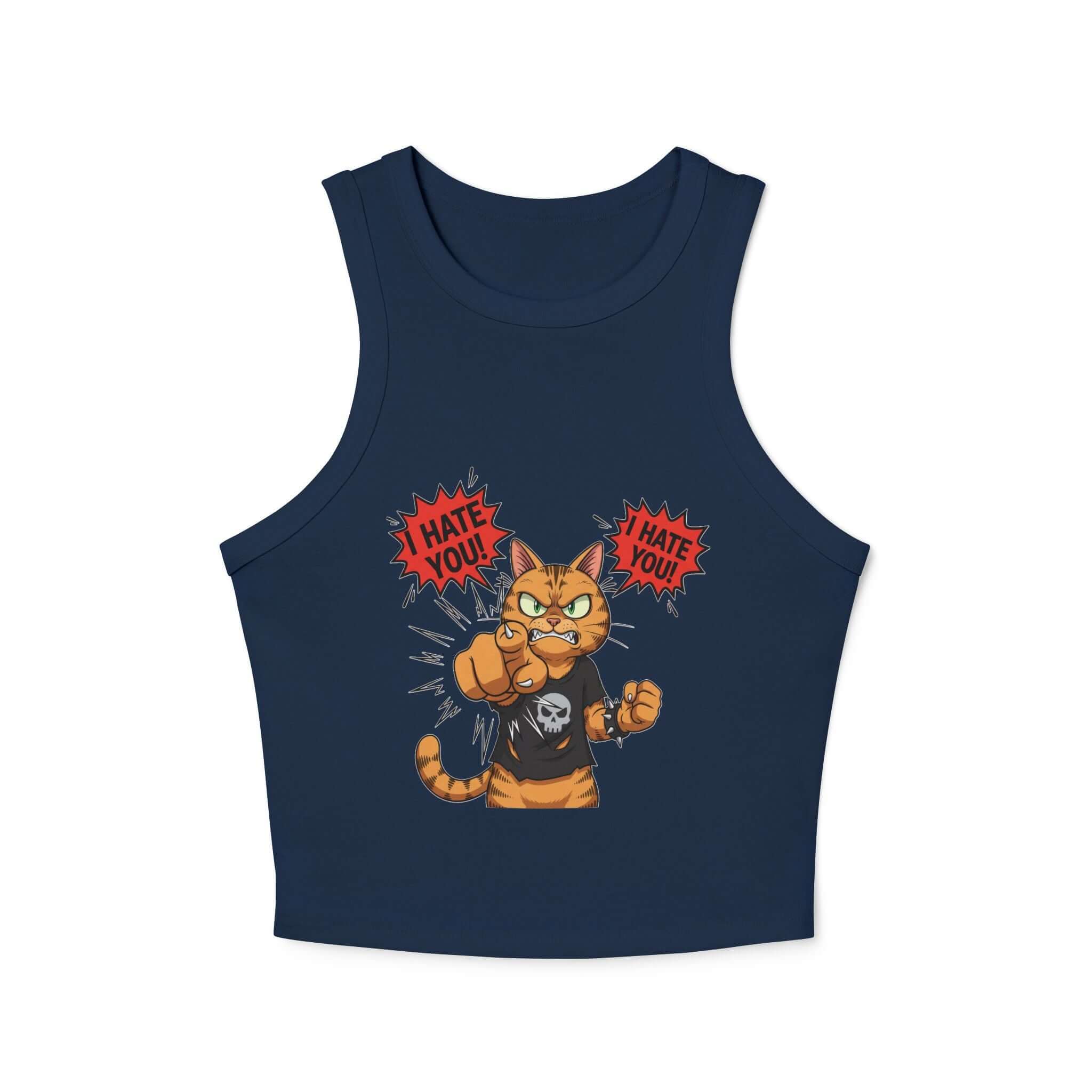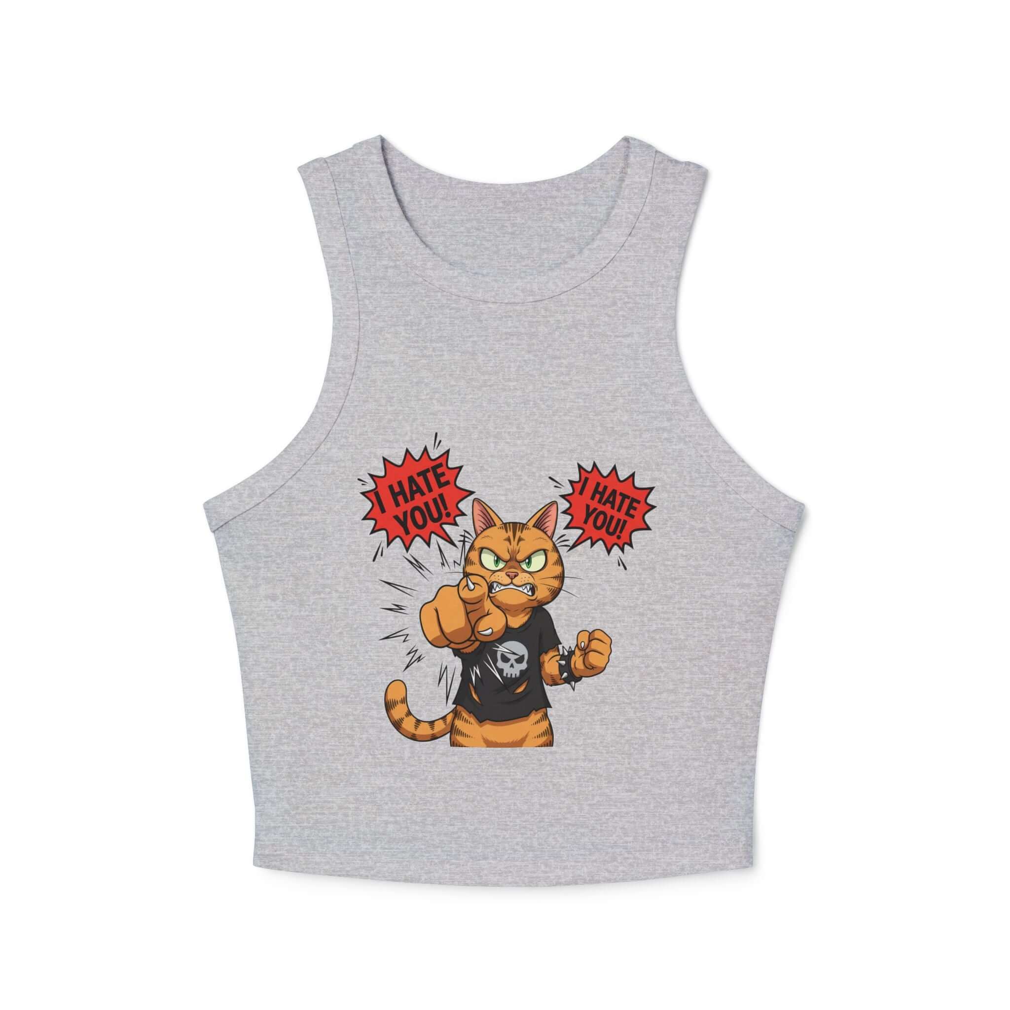 Angry Cat ‘I Hate You’ Graphic style 1 Women Tank Top, a fitted micro-rib racer tank that brings playful edge to everyday wear. Soft, lightweight fabric with a subtle rib texture hugs the body while the high neckline and mid-length cut create a modern, layered-ready silhouette. The bold, cartoon cat graphic adds a cheeky, rebellious vibe—great for street-style looks, skate sessions, or coffee shop afternoons. Breathable and stretchy, it moves with you whether you’re out with friends or lounging at home. Finished with a tear-away label for itch-free comfort and a smooth DTF print that stays vibrant wash after wash.Product features- 52% Airlume combed & ringspun cotton, 48% polyester (varies by color)- 1×1 micro rib for subtle texture and stretch- Fitted stretch fit with mid-length cut- High neck racer style for contemporary layering- Tear-away label and DTF printed graphic for comfort and lasting colorCare instructions- Machine wash: cold (max 30C or 90F)- Non-chlorine: bleach as needed- Tumble dry: low heat- Iron, steam or dry: low heat- Do not dryclean XS S M L XL 2XL Width, in 13.25 14.00 14.75 15.75 16.75 17.75 Length, in 18.50 19.00 19.62 20.37 21.12 21.87