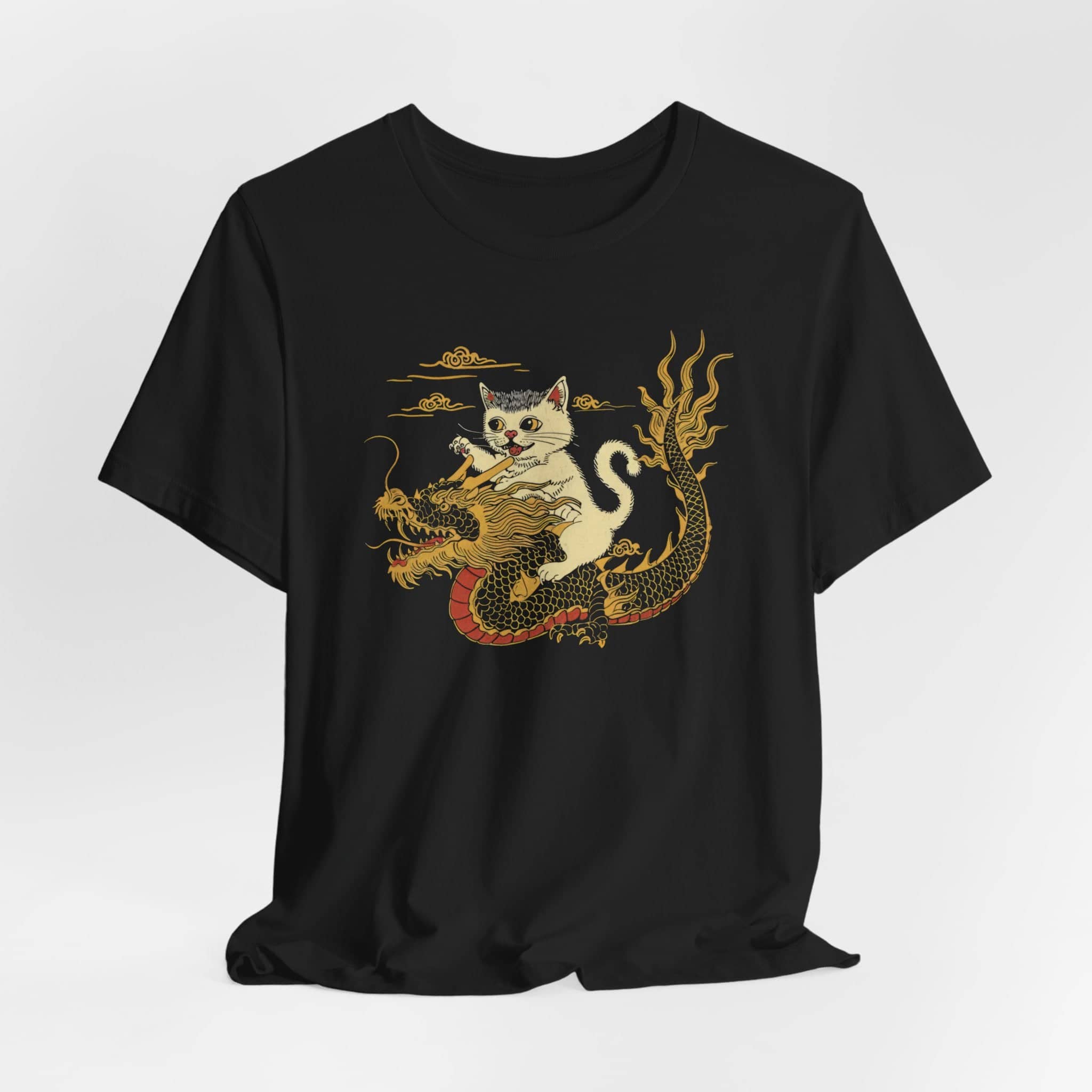 Cat Riding Dragon Epic T-Shirt Unleash your inner warrior with our Cat Riding Dragon Epic T-Shirt! 🐉🐱 This captivating tee features a brave cat riding a powerful dragon, perfect for fantasy lovers and adventure enthusiasts. The intricate design combines mythical elements with a playful twist, creating a unique and striking look. Made from high-quality, soft fabric, it ensures comfort and durability. Stand out from the crowd and embrace your adventurous side with this extraordinary t-shirt! Why You’ll Love It: 👕 Ultimate Comfort: Made with 100% Airlume combed and ring-spun cotton, this tee offers a lightweight (4.2 oz/yd² or 142 g/m²) and breathable fabric that’s perfect for both active and leisure wear. 👔 Versatile Style: The retail fit and classic crew neckline make this shirt perfect for casual outings and semi-formal settings alike. Accessorize easily to create your unique look! 👍 Durable Quality: Ribbed knit collars and tapered shoulders ensure a better fit over time, while dual side seams hold the garment’s shape longer, wash after wash. 🌱 Ethically Made: Bella+Canvas products are manufactured in the USA and internationally in a humane, no-sweat-shop, sustainable manner. Proudly part of the Fair Labor Association and Platinum WRAP certified. 🔖 No Irritation: Featuring a tear-away label for added comfort, say goodbye to annoying tags! Fabric Details: 🧵 Solid Colors: 100% Airlume combed and ring-spun cotton 🧵 Ash and Heather Prism: 99% Airlume combed and ring-spun cotton, 1% polyester 🧵 Heather and Solid Blends: 52% cotton, 48% polyester 🧵 Athletic Heather and Black Heather: 90% cotton, 10% polyester Perfect For: 🎁 Gift Giving: An excellent gift for birthdays, holidays, or any special occasion for cat and fashion lovers. 🌳 Everyday Wear: Whether you’re running errands, meeting friends, or just relaxing at home, this shirt is your go-to choice.