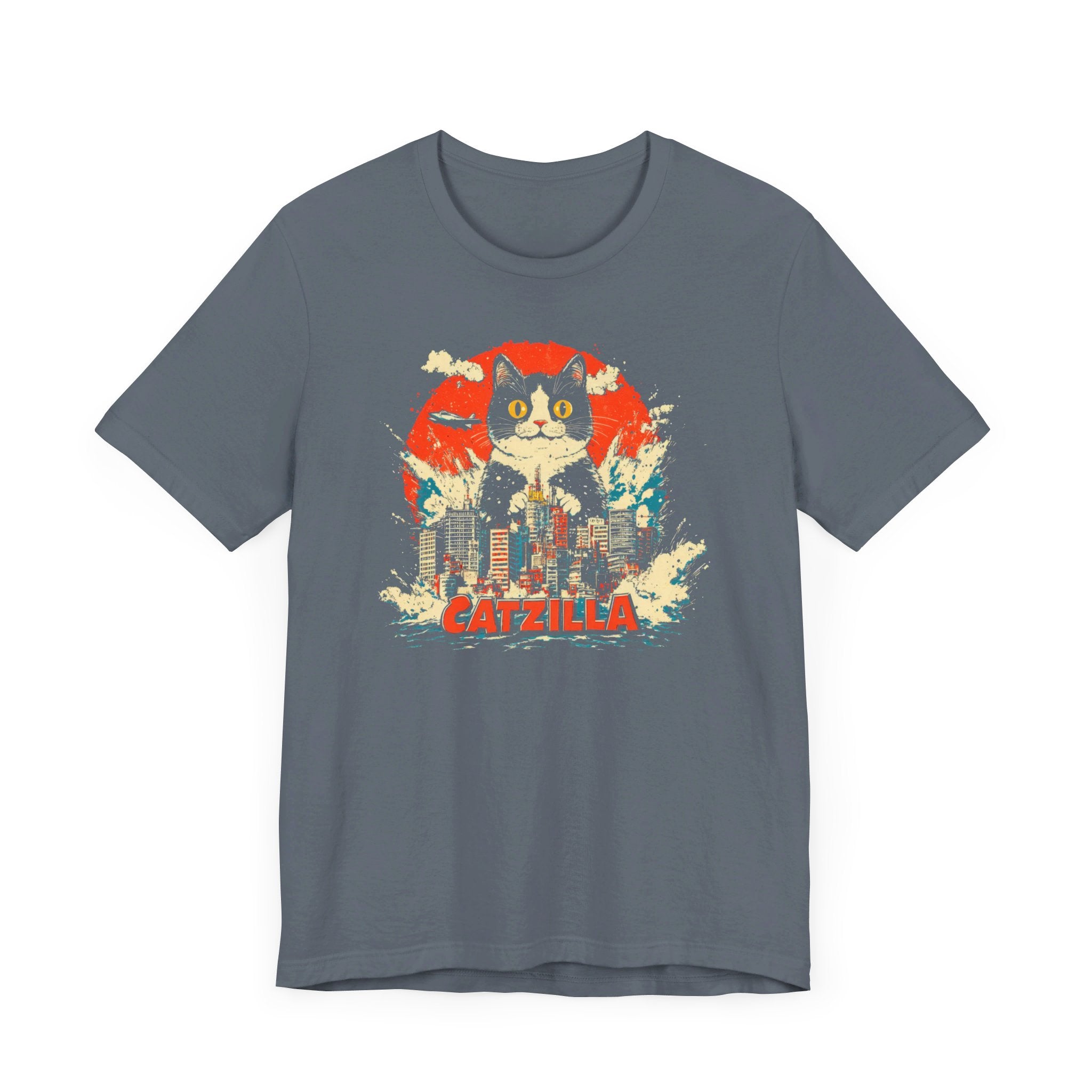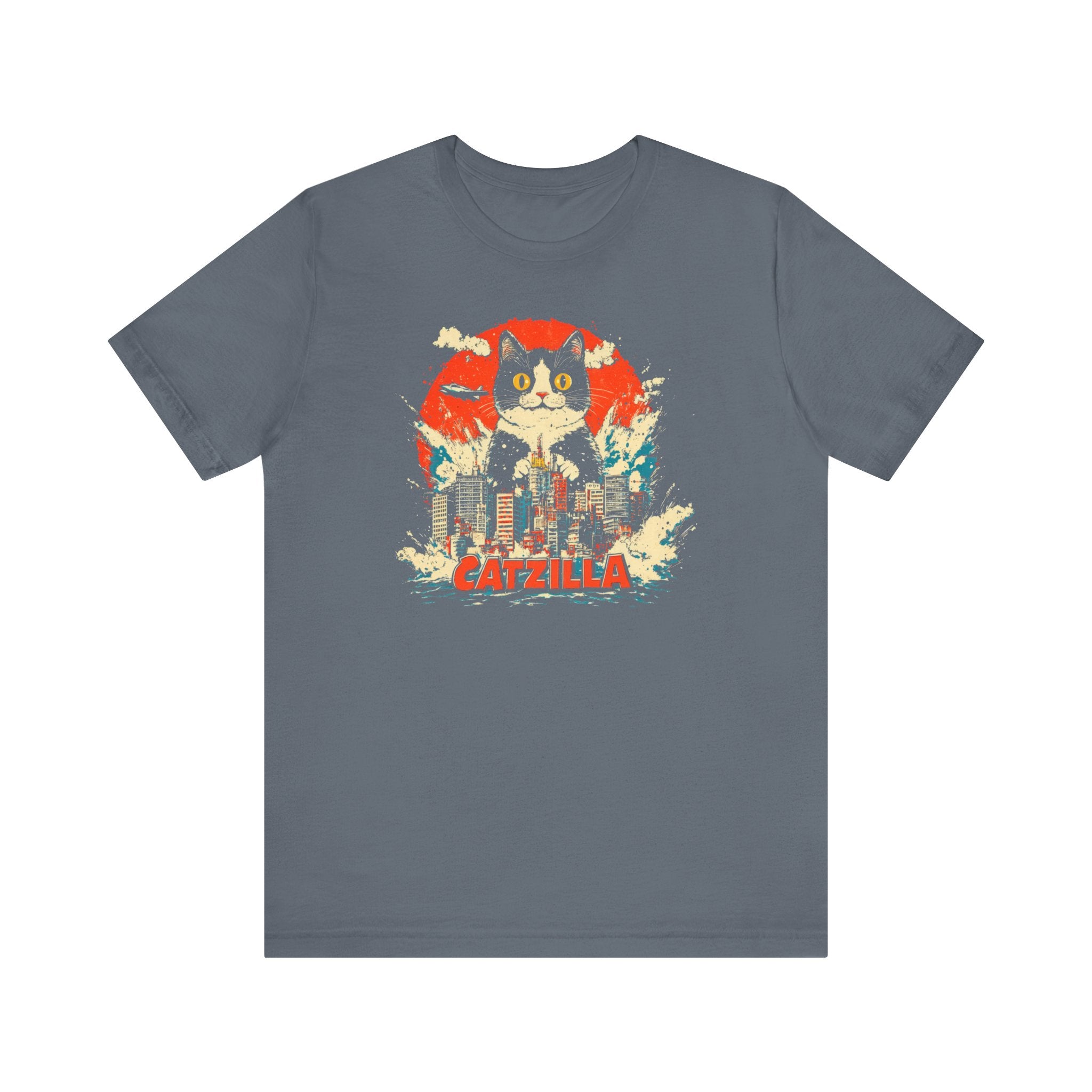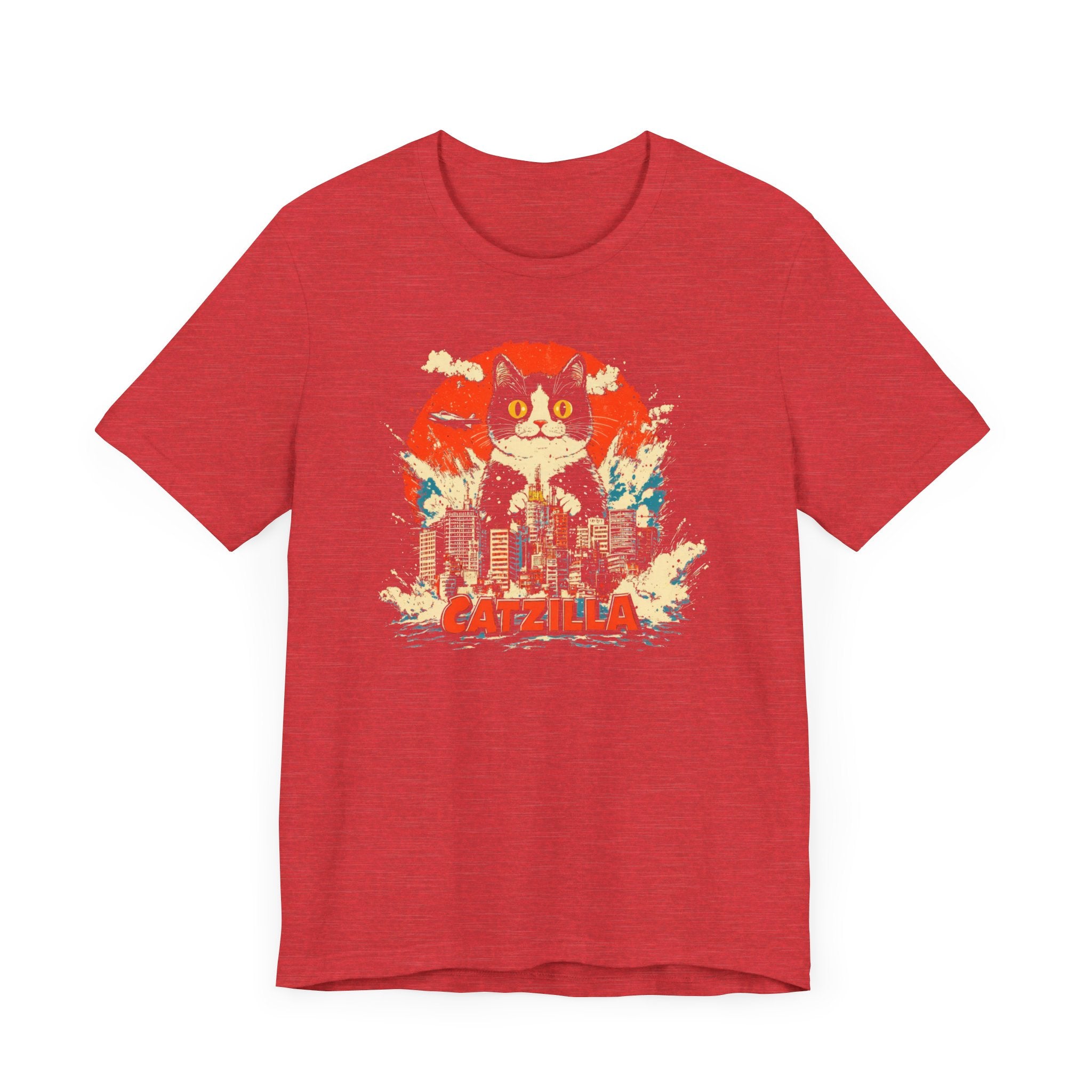 Get ready for a feline frenzy with our Catzilla City Smash T-Shirt! 🐱🌆 This playful design features the mighty Catzilla making waves and smashing through the city. Perfect for cat lovers with a sense of humor, this tee adds a fun and quirky touch to your collection. Let Catzilla bring some excitement to your everyday style! Why You’ll Love It: 👕 Ultimate Comfort: Made with 100% Airlume combed and ring-spun cotton, this tee offers a lightweight (4.2 oz/yd² or 142 g/m²) and breathable fabric that’s perfect for both active and leisure wear. 👔 Versatile Style: The retail fit and classic crew neckline make this shirt perfect for casual outings and semi-formal settings alike. Accessorize easily to create your unique look! 👍 Durable Quality: Ribbed knit collars and tapered shoulders ensure a better fit over time, while dual side seams hold the garment’s shape longer, wash after wash. 🌱 Ethically Made: Bella+Canvas products are manufactured in the USA and internationally in a humane, no-sweat-shop, sustainable manner. Proudly part of the Fair Labor Association and Platinum WRAP certified. 🔖 No Irritation: Featuring a tear-away label for added comfort, say goodbye to annoying tags! Fabric Details: 🧵 Solid Colors: 100% Airlume combed and ring-spun cotton 🧵 Ash and Heather Prism: 99% Airlume combed and ring-spun cotton, 1% polyester 🧵 Heather and Solid Blends: 52% cotton, 48% polyester 🧵 Athletic Heather and Black Heather: 90% cotton, 10% polyester Perfect For: 🎁 Gift Giving: An excellent gift for birthdays, holidays, or any special occasion for cat and fashion lovers. 🌳 Everyday Wear: Whether you’re running errands, meeting friends, or just relaxing at home, this shirt is your go-to choice.