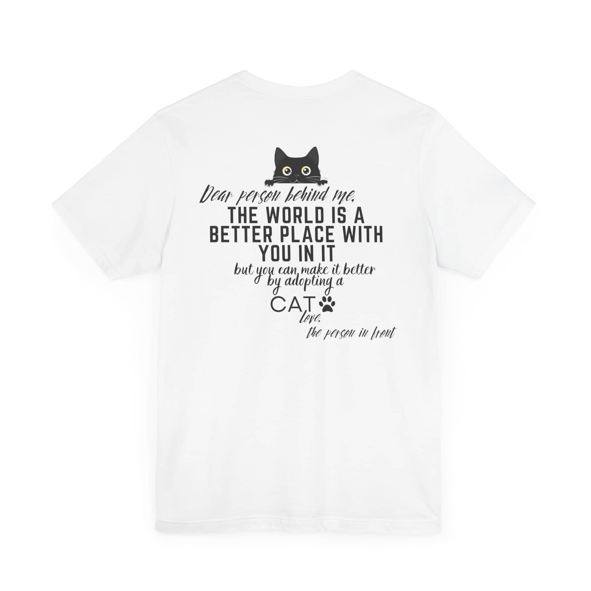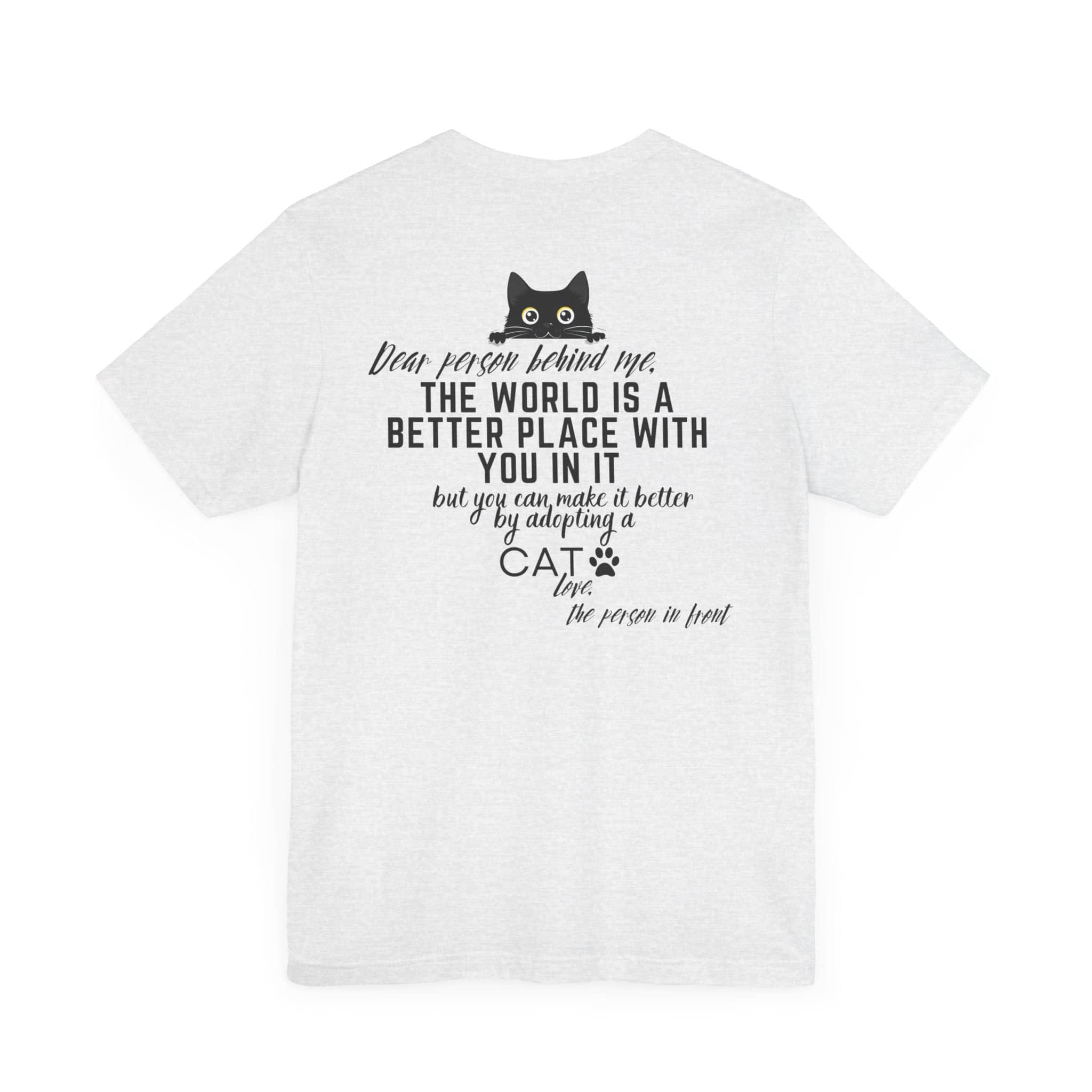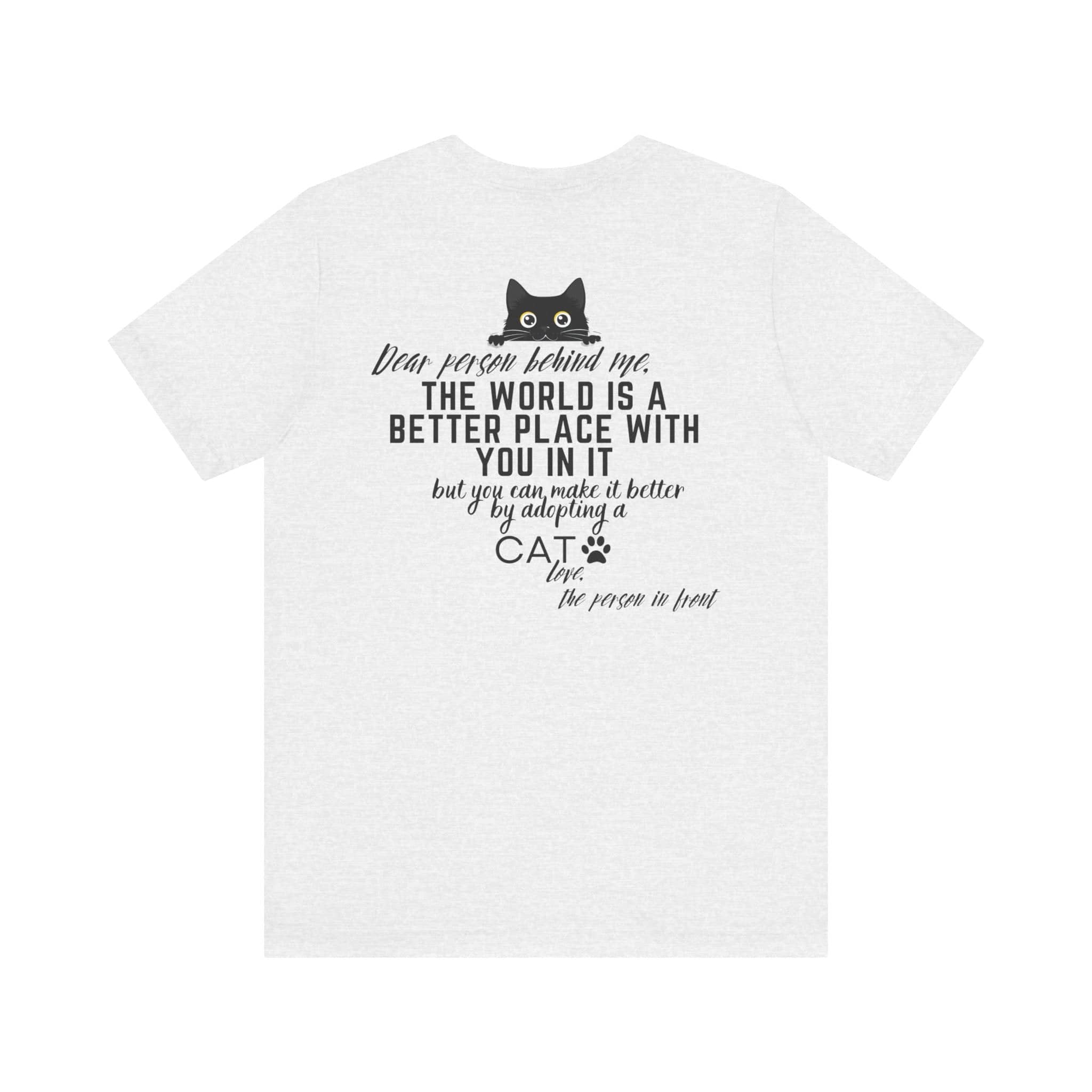 💖 Share the Love and Make a Difference with Our “Dear Person Behind Me” Cat Adoption T-Shirt! Featuring a sweet message and an adorable cat graphic, this tee is perfect for cat lovers and anyone who wants to spread positivity. Made from soft, high-quality fabric, it offers comfort and inspiration for any casual occasion. Whether you’re out and about or just want to encourage others to adopt a cat, this shirt is a wonderful way to brighten someone’s day. Wear it proudly and let the positive vibes flow! 😺✨ Why You’ll Love It: 🌟 Supreme Comfort: Made from 100% Airlume combed and ring-spun cotton, this lightweight fabric (4.2 oz/yd²) is breathable and perfect for layering. 🧥 Perfect Fit: The classic unisex jersey short sleeve fits like a well-loved favorite, with ribbed knit collars to bolster shaping and tapered shoulders for a better fit over time. 💧 Durable Design: Dual side seams hold the garment’s shape for longer, ensuring your tee looks great wash after wash. 🌿 Ethically Made: Bella+Canvas manufactures all its products in the US and internationally in a humane, no-sweat-shop, sustainable way. They are part of the Fair Labor Association and Platinum WRAP certified. 👚 Versatile Style: The retail fit and crew neckline add a classic, neat style perfect for casual and semi-formal settings, making it easy to accessorize. 🏷️ Comfort in Detail: Tear-away label minimizes skin irritations for all-day comfort. Fabric Blends: ✨ Ash and Heather Prism colors: 99% Airlume combed and ring-spun cotton, 1% polyester. ✨ Heather and Solid Blend colors: 52% cotton, 48% polyester. ✨ Athletic Heather and Black Heather: 90% cotton, 10% polyester. 📦 Made to Order Process: Each shirt is printed just for you, ensuring a unique and personal touch. Please allow a few extra days for delivery as we create your custom tee. 🎁 Perfect Gift: This tee makes a thoughtful gift for anyone who loves spreading positivity and encouraging pet adoption. Ideal for birthdays, holidays, or just because!