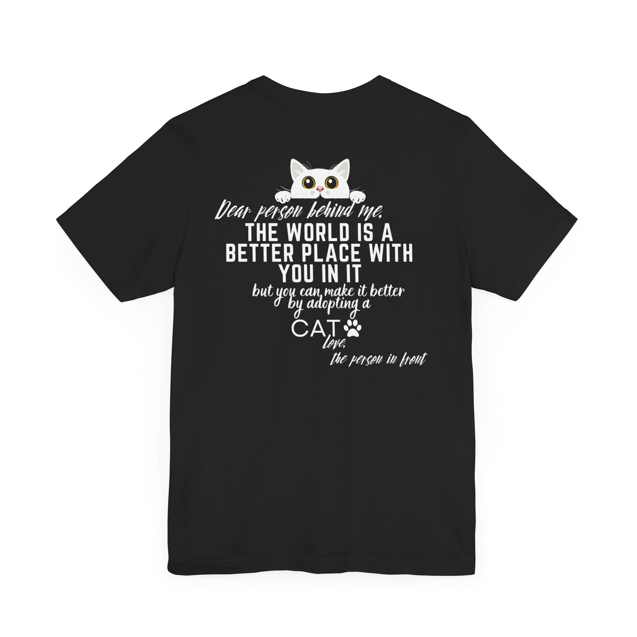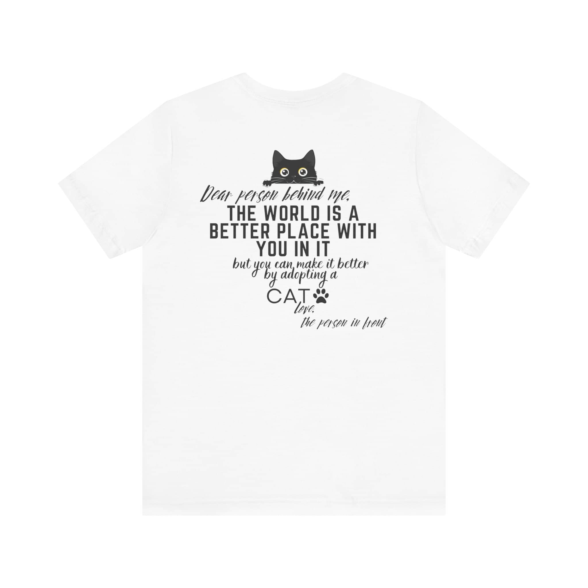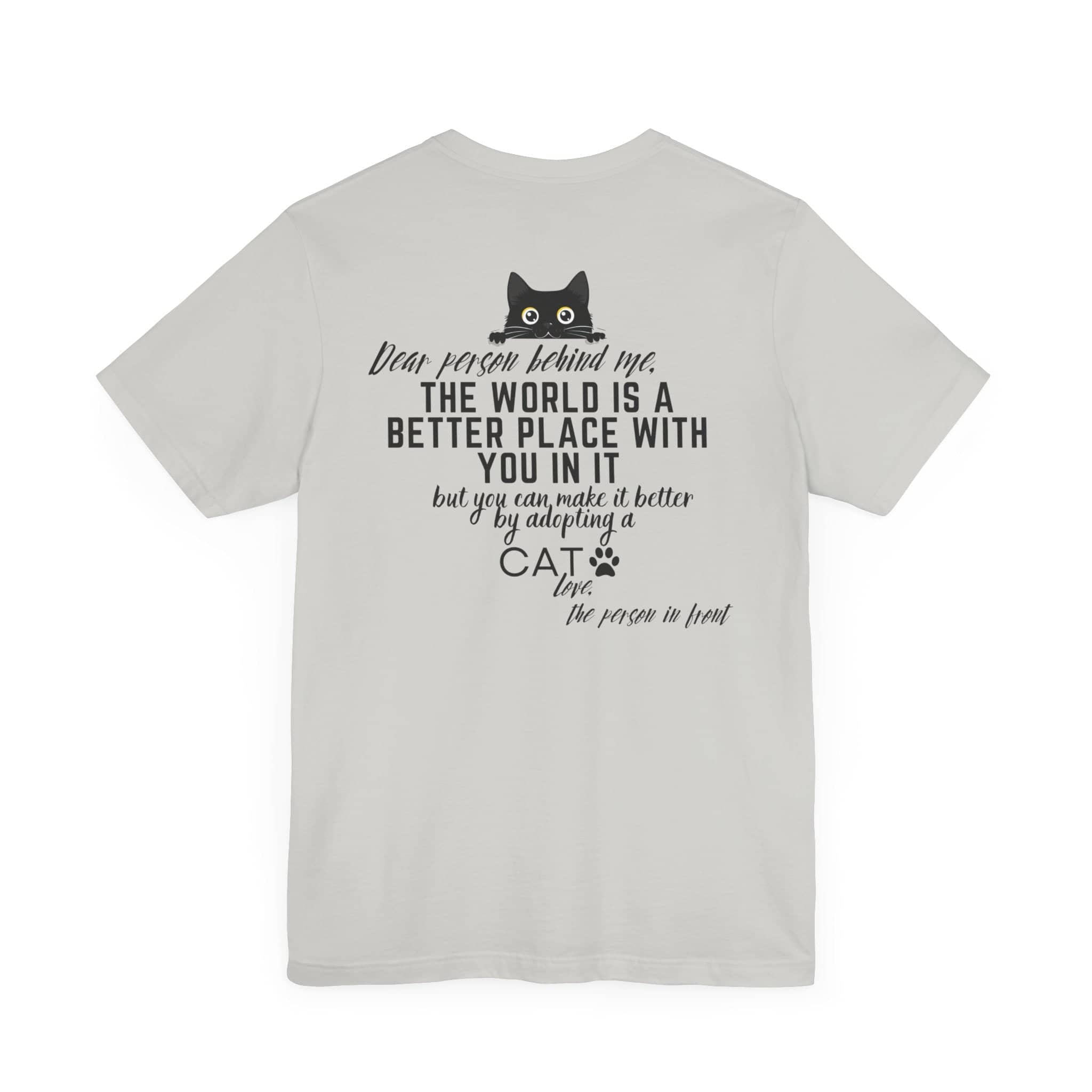 💖 Share the Love and Make a Difference with Our “Dear Person Behind Me” Cat Adoption T-Shirt! Featuring a sweet message and an adorable cat graphic, this tee is perfect for cat lovers and anyone who wants to spread positivity. Made from soft, high-quality fabric, it offers comfort and inspiration for any casual occasion. Whether you’re out and about or just want to encourage others to adopt a cat, this shirt is a wonderful way to brighten someone’s day. Wear it proudly and let the positive vibes flow! 😺✨ Why You’ll Love It: 🌟 Supreme Comfort: Made from 100% Airlume combed and ring-spun cotton, this lightweight fabric (4.2 oz/yd²) is breathable and perfect for layering. 🧥 Perfect Fit: The classic unisex jersey short sleeve fits like a well-loved favorite, with ribbed knit collars to bolster shaping and tapered shoulders for a better fit over time. 💧 Durable Design: Dual side seams hold the garment’s shape for longer, ensuring your tee looks great wash after wash. 🌿 Ethically Made: Bella+Canvas manufactures all its products in the US and internationally in a humane, no-sweat-shop, sustainable way. They are part of the Fair Labor Association and Platinum WRAP certified. 👚 Versatile Style: The retail fit and crew neckline add a classic, neat style perfect for casual and semi-formal settings, making it easy to accessorize. 🏷️ Comfort in Detail: Tear-away label minimizes skin irritations for all-day comfort. Fabric Blends: ✨ Ash and Heather Prism colors: 99% Airlume combed and ring-spun cotton, 1% polyester. ✨ Heather and Solid Blend colors: 52% cotton, 48% polyester. ✨ Athletic Heather and Black Heather: 90% cotton, 10% polyester. 📦 Made to Order Process: Each shirt is printed just for you, ensuring a unique and personal touch. Please allow a few extra days for delivery as we create your custom tee. 🎁 Perfect Gift: This tee makes a thoughtful gift for anyone who loves spreading positivity and encouraging pet adoption. Ideal for birthdays, holidays, or just because!