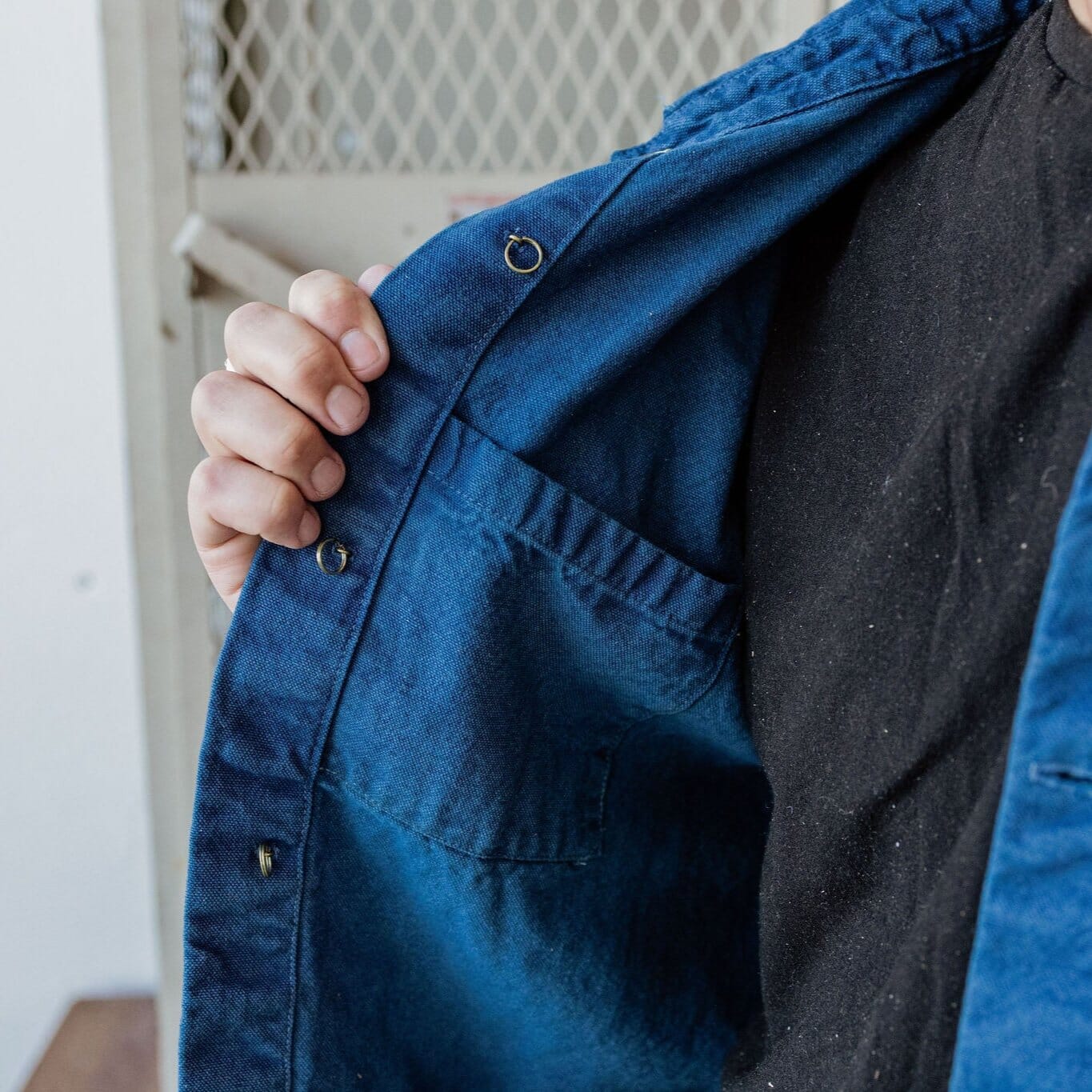Introducing the Doctor’s Coat. This jacket is a perfect transition piece between hot and cold seasons (and cold to hot!). Layer with a flannel, or simply wear it over a t-shirt. This jacket has been indigo dyed with real indigo leaves in the USA. It also features “butcher” buttons which are fastened with a metal pin and ring for a stronger hold. This coat also features a unique front pen pocket that fits a short pen or pencil, or a doctors knife. 10 oz Indigo Dyed Duck Canvas (Indigo will transfer to light clothing for the first few wears). Japanese style bucher buttons. Chest Pocket with Unique Pen Slot. Interior Chest Pocket Chore Pockets Pre-Shrunk Made in USA Click here for sizing chart Made in Nashville, USA