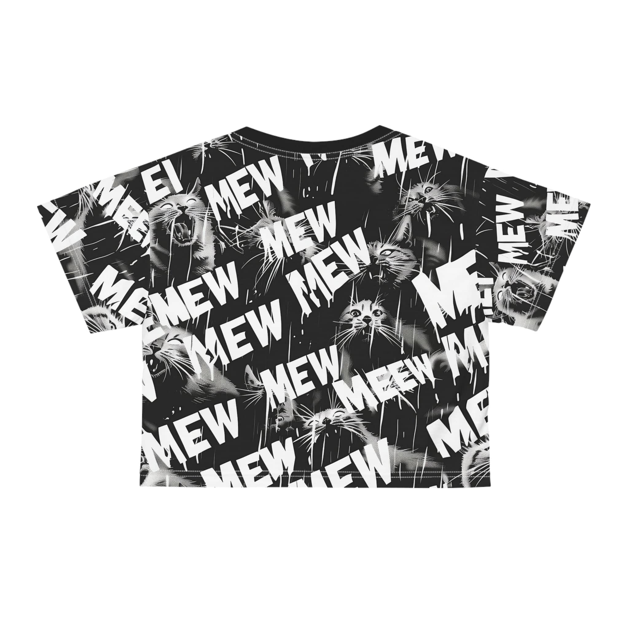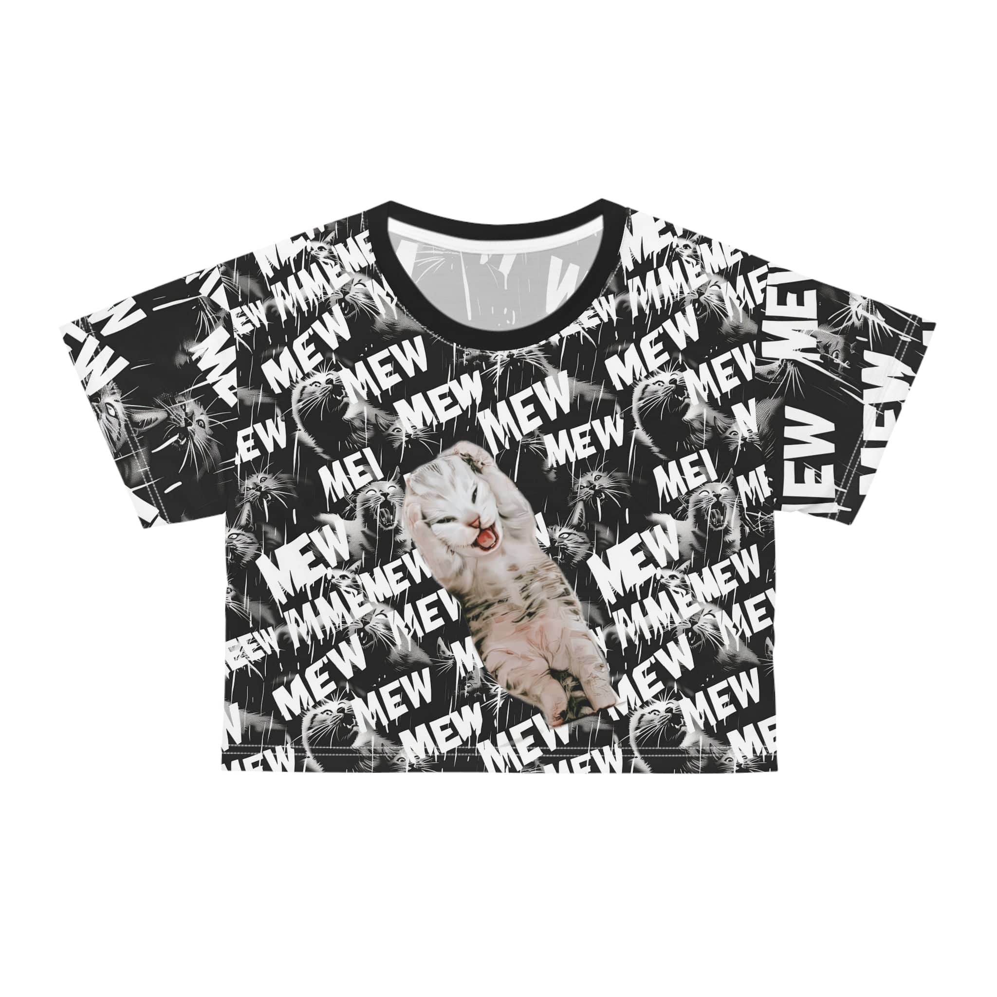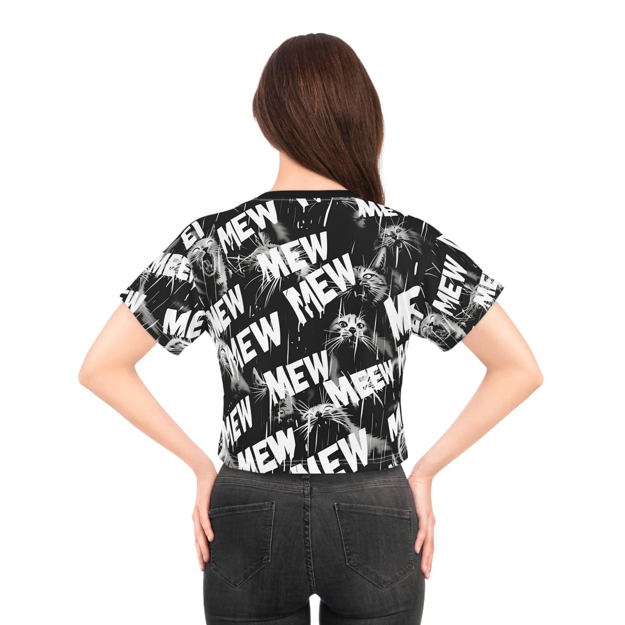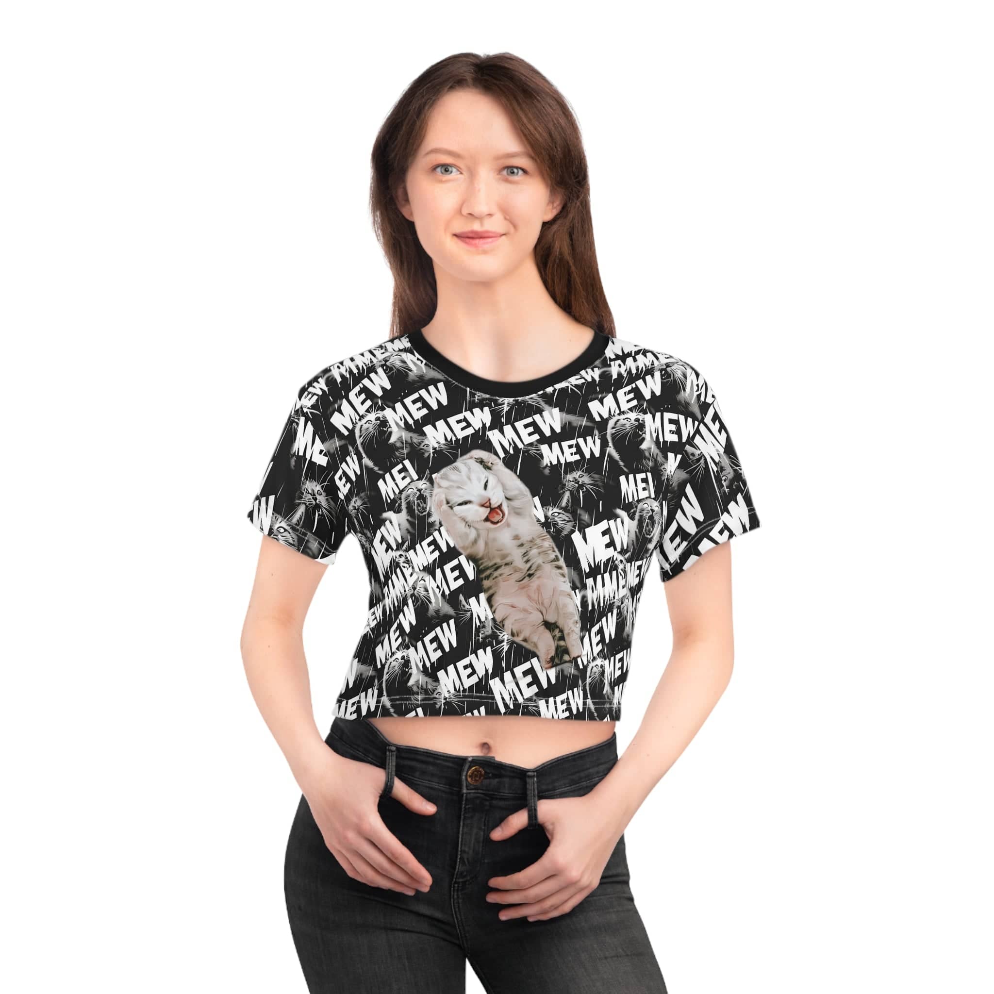 Unleash your love for felines with a twist of drama in this “Dramatic Kitty All-Over Print T-Shirt.” Designed for the cat aficionado with a flair for the theatrical, this shirt features a bold and expressive kitty amidst a backdrop of cascading ‘MEW’ motifs. The monochromatic palette makes this shirt a versatile addition to your wardrobe, capable of turning heads and sparking conversations wherever you go. Perfect for casual outings, cozy afternoons, or your next social media post, this t-shirt promises to be the purr-fect statement piece for any cat lover’s collection. Embrace your inner cat’s dramatic side and wear it out loud! This personalized crop top has both comfort and style in spades. Add whimsical patterns, feel-good designs and create a unique AOP crop tee that’s perfect for everyday wear. Made 100% with silky soft polyester that is both lightweight and breathable. .: 100% polyester.: Light fabric (6 oz/yd² (203 g/m²)).: Sewn-in care label.: Assembled in the USA from globally sourced parts