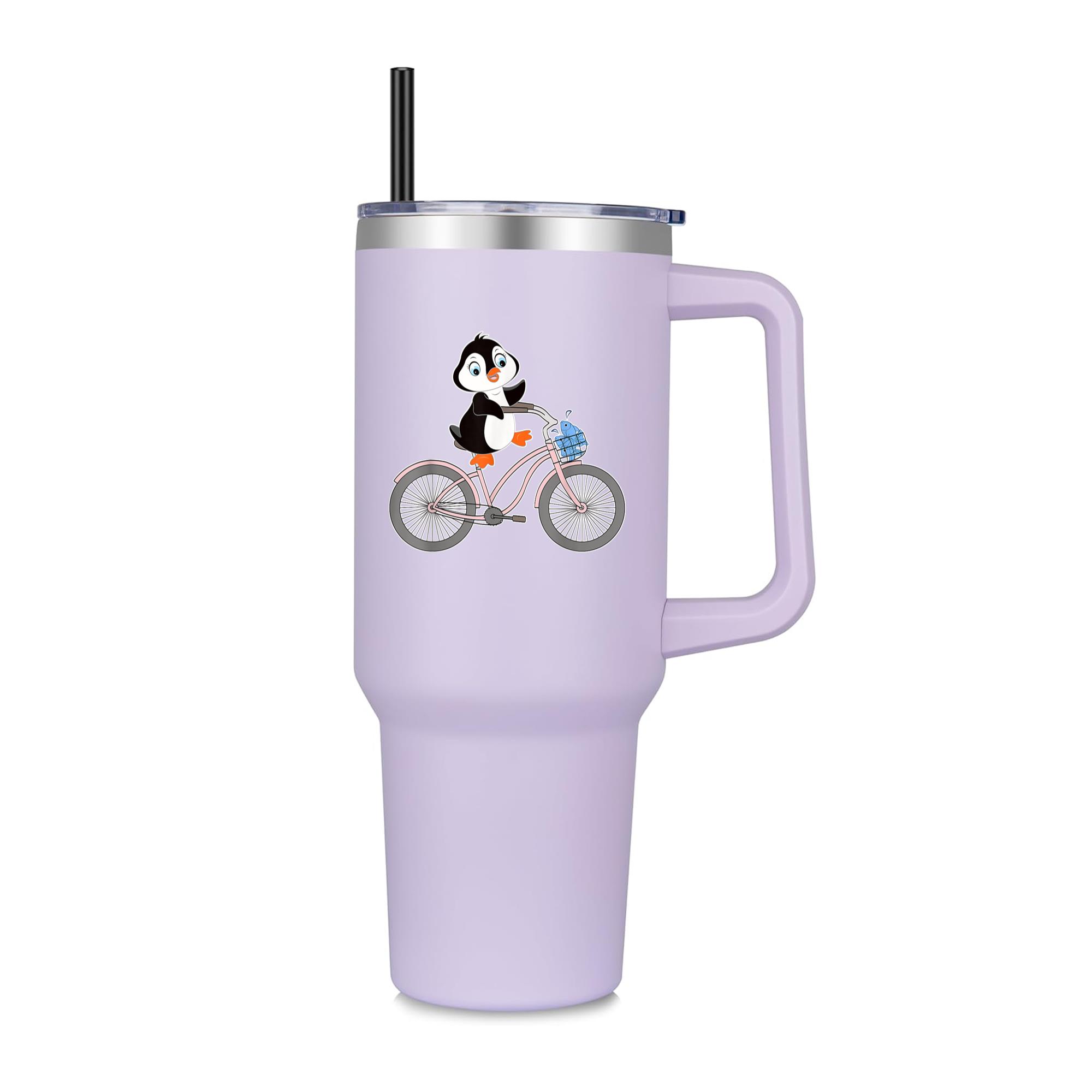 Penguin Graphic On Bike 40oz Stainless Steel Tumbler 40oz Stainless Steel Tumbler with Handle and Straw – Double-Wall Vacuum Insulated Travel Mug with Lid